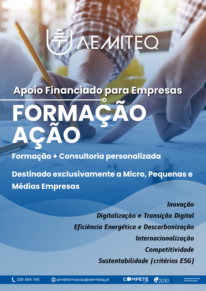A FORMAÇÃO-AÇÃO é um projeto COFINANCIADO pelo COMPETE 2030 destinado ao desenvolvimento das PMEs e que combina de forma Inovadora Consultoria e Formação, mediante um diagnóstico e elaboração de planos de ação adaptados às necessidades das mesmas, numa das seguintes temáticas (com possibilidade de intervenção em outras áreas):